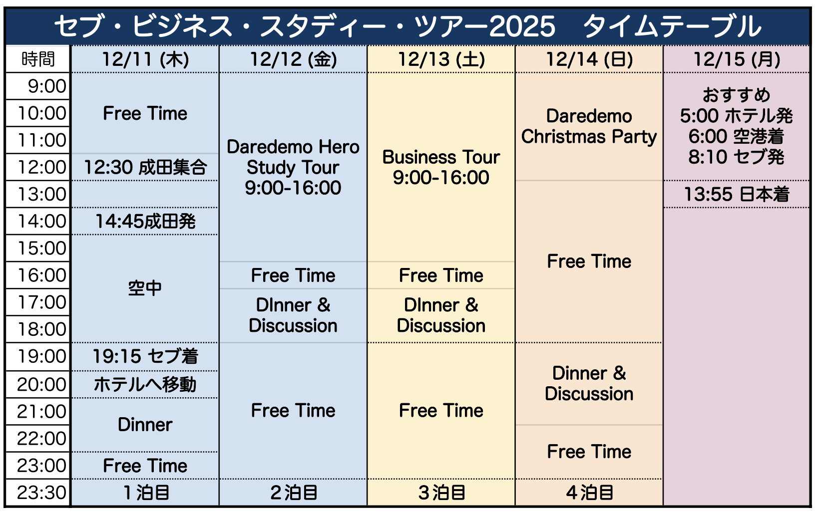 ・前乗り、延泊等していただいて問題ありません。イムランは12月11日にセブ入りし、12月15日以降に東京に戻ります。